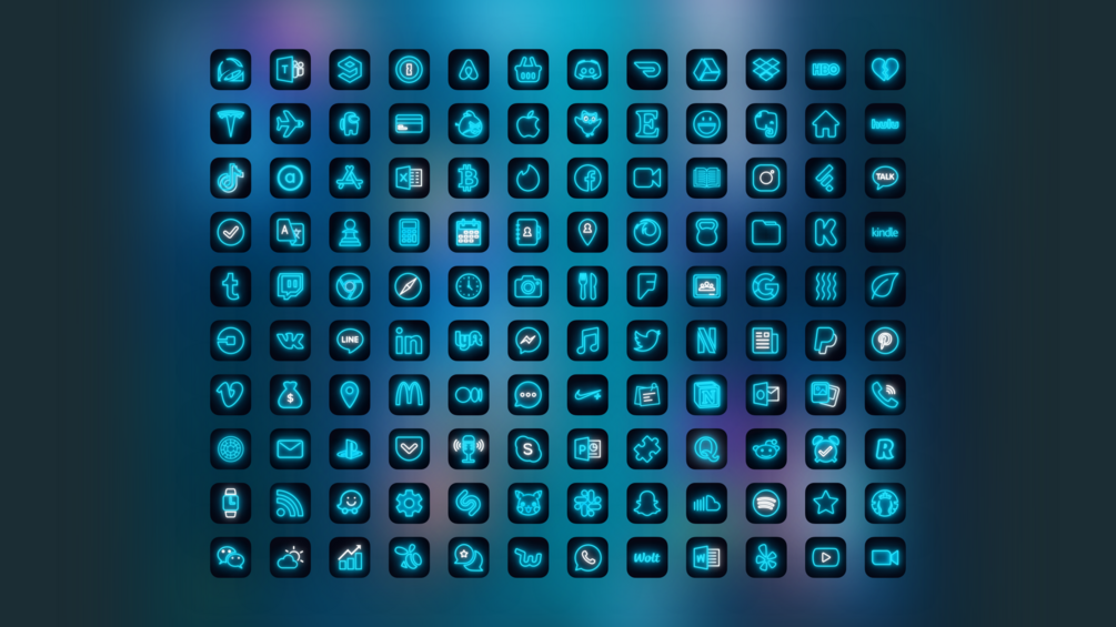 - 120 app icons in turquoise neon style (Amazon, Among Us, App Store, Airbnb, Asos, Apple, Angry Birds, Bank, Bitcoin, Books, Browser, Calculator, Calendar, Camera, Chess, Clock, Chrome, Contacts, DoorDash, Dropbox, Drive, Duolingo, Discord, Emoji, Etsy, Evernote, Excel, Facebook, Facetime, Feedly, Find my Friend, Fitness, Folder, Food Delivery, Firefox, Foursquare, Google, Google Classroom, HBO, Health, Home, Hulu, Instagram, KakaoTalk, Kickstarter, Kindle, Kitchen Stories, Line, Leaf, LinkedIn, Lyft, Mail, Maps, Medium, McDonalds, Messages, Messenger, Music, Nike+, Netflix, News, Notes, Notion, Outlook, PayPal, Phone, Photos, Pinterest, Powerpoint, Podcasts, Pokemon Go, Puzzle, Pocket, Playstation, Quora, Reddit, Reminders, Revolut, RSS, Settings, Shazam, Skype, Slack, Snapchat, Spotify, Star, Starbucks, Stocks, Soundcloud, Swarm, Taco Bell, Tesla, Teams, TestFlight, Tiktok, Tinder, To-Do List, Translator, Tumblr, Twitch, Twitter, Uber, Vimeo, VKontakte, VSCO, Wish, Wallet, Watch, Waze, WeChat, Weverse, WhatsApp, Weather, Wolt, Word, Yelp, Youtube, Zoom, 9gag, 1Password)